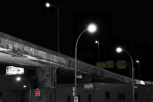 I was waiting for bus 17 at 4 something because I was moving in to a new apartment in March and I was going back and forth between the new and the old place to move the little stuff. It was a cold day and I was there in the dark waiting on St-Jacques street in St-Henri. My camera was among the stuff I was moving so I thought why not use it while it is there and I took a picture of the highway (I think 20).